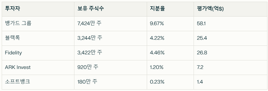 - 2025년 3월 기준: 84.9만 주 보유(약 3,500만 달러)
